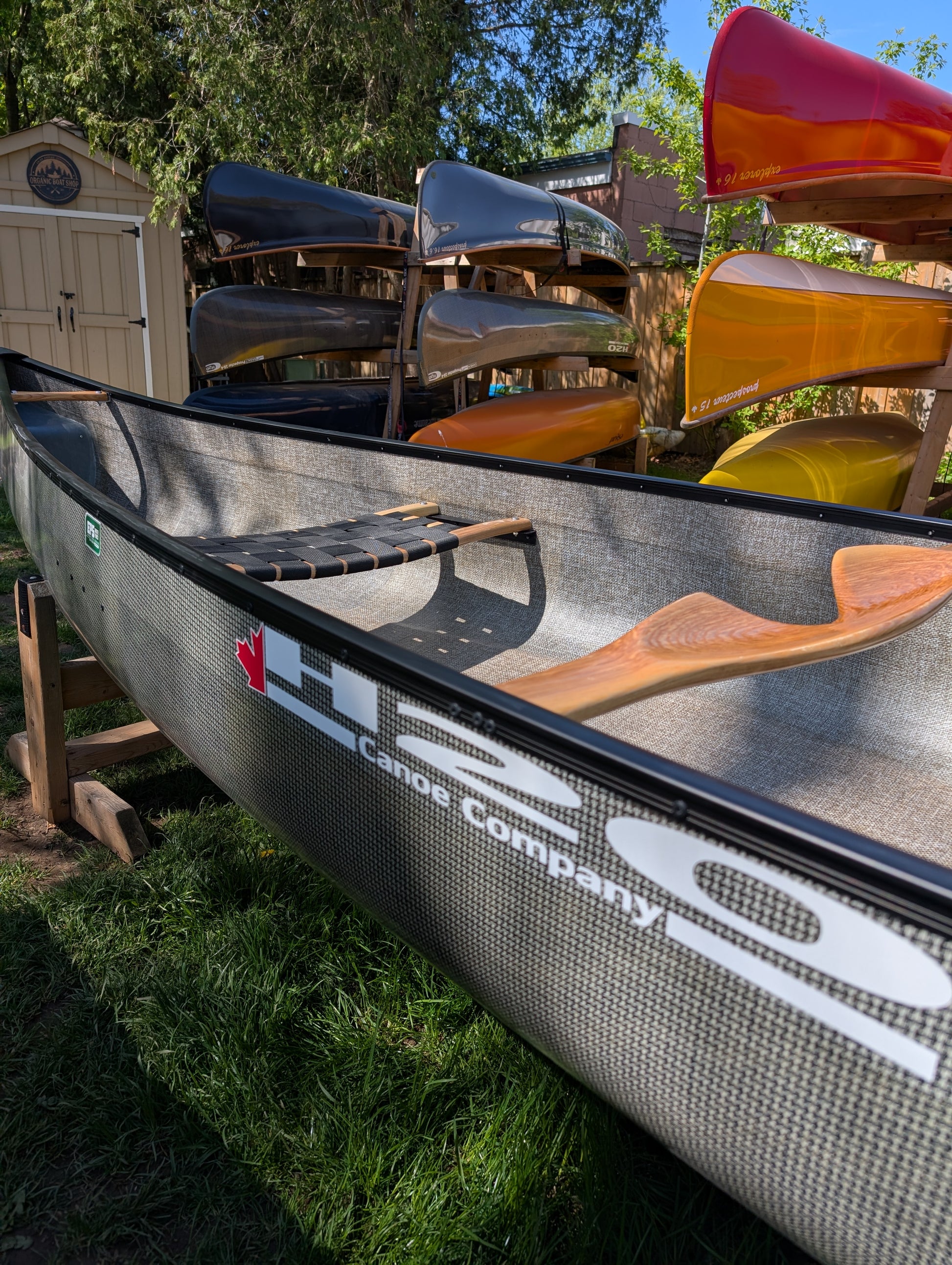 H2O's Canadian 16-6 Canoe is a close replica of an “early settler canoe” originally discovered in Southwestern Ontario in the early 1900’s. H2O’s design embodies the finest characteristics from this exceptional craft along with H2O’s own modern refinements. The resulting combination may just be the ultimate “Canadian” canoe. The essence and versatility of traditional canoes is captured with a symmetrical style hull and re-curved ends, made famous by First Nations Peoples. To reduce wind resistance and maximize efficiency a slightly longer length and narrower beam are carefully combined with sharp entry and exit lines and a lower sheer. The Canadian’s shallow arch hull design and shoe keel provide a rare blend of performance and styling sought by many canoe builders, but seldom achieved. H2O's Canadian 16- 6 is a stable, well-mannered and predictable craft, which successfully blends efficiency and a user-friendly nature, while retaining a distinctly traditional “Canadian canoe appearance”.