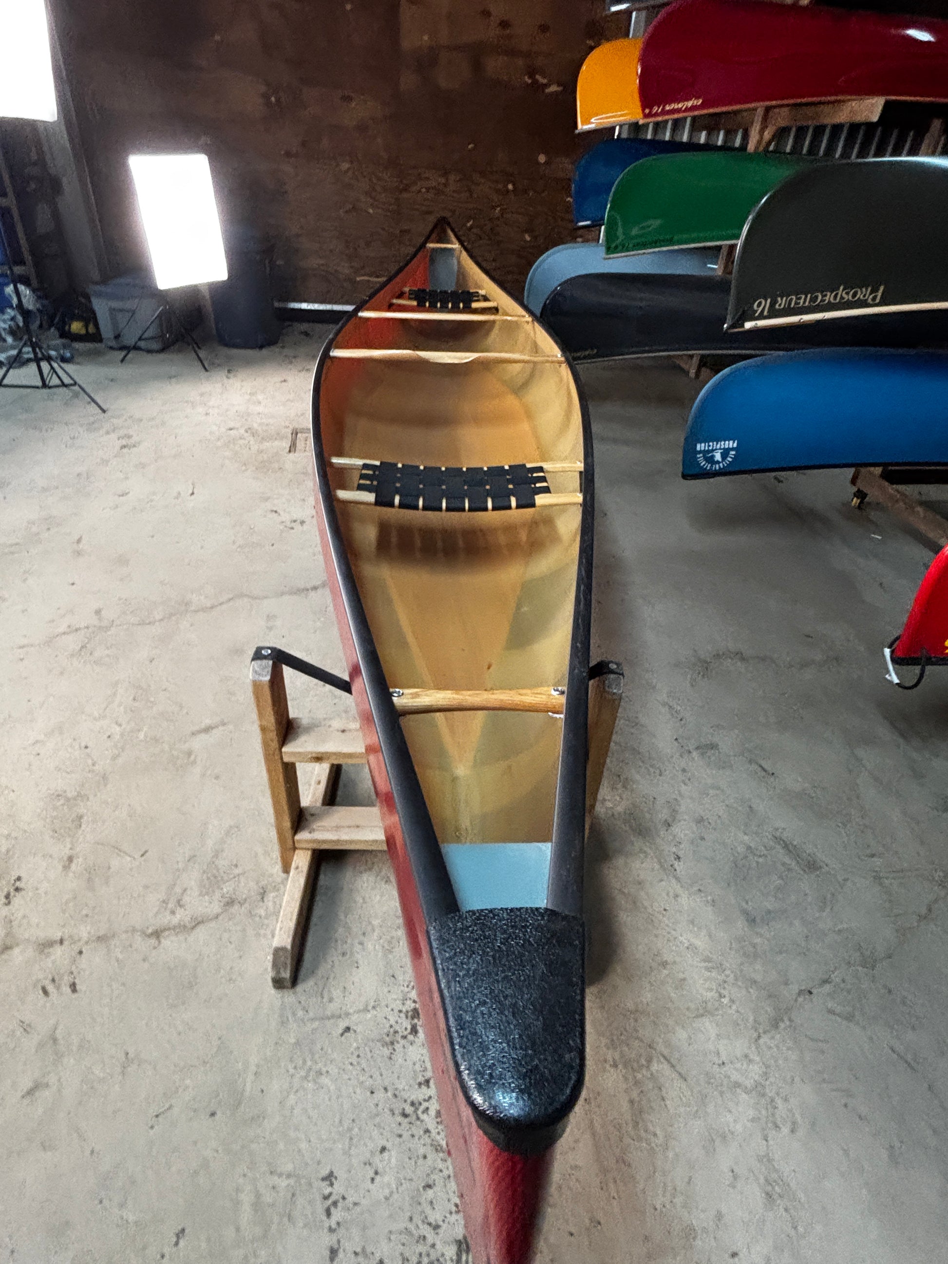 H2O Canoe Company's Prospector 16- 4 is simply a scaled down version of their Prospector 16-4. A semi-round hull, moderate rocker and a traditional symmetrical shape combine to create a nimble, responsive craft for most water conditions. The 15-4’s shorter length purposely sacrifices a slight degree of initial stability to heighten an all-round maneuverability, to controlled paddler leans and turns. Sharp entry lines flare out quickly to increase buoyancy, and when combined with moderate rocker to better float over large waves, rather than go through them. Tumblehome sides improve secondary stability and enhance both solo and tandem paddling.