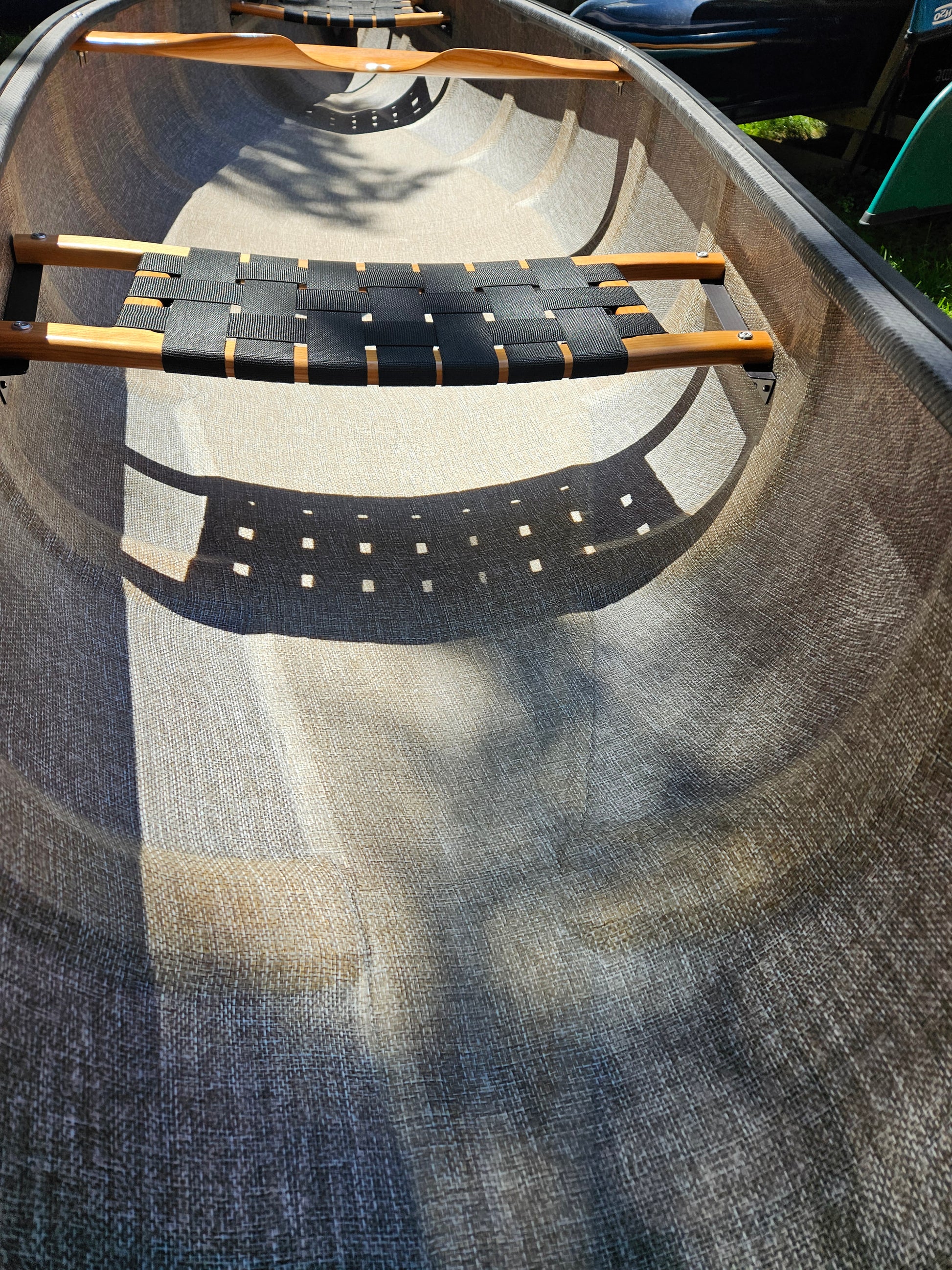 The rib system keeps the canoe rigid enough to perform, while creating just enough flex between ribs to absorb impact. It is subtle, but even the area surrounding the seat mount includes a cross rib for strength to support a seat bracket, which is both adhered and riveted to the hull. When the seat is fastened to this mount there is no movement or sway and the strength in the hull is increased similarly to a truss construction technique.